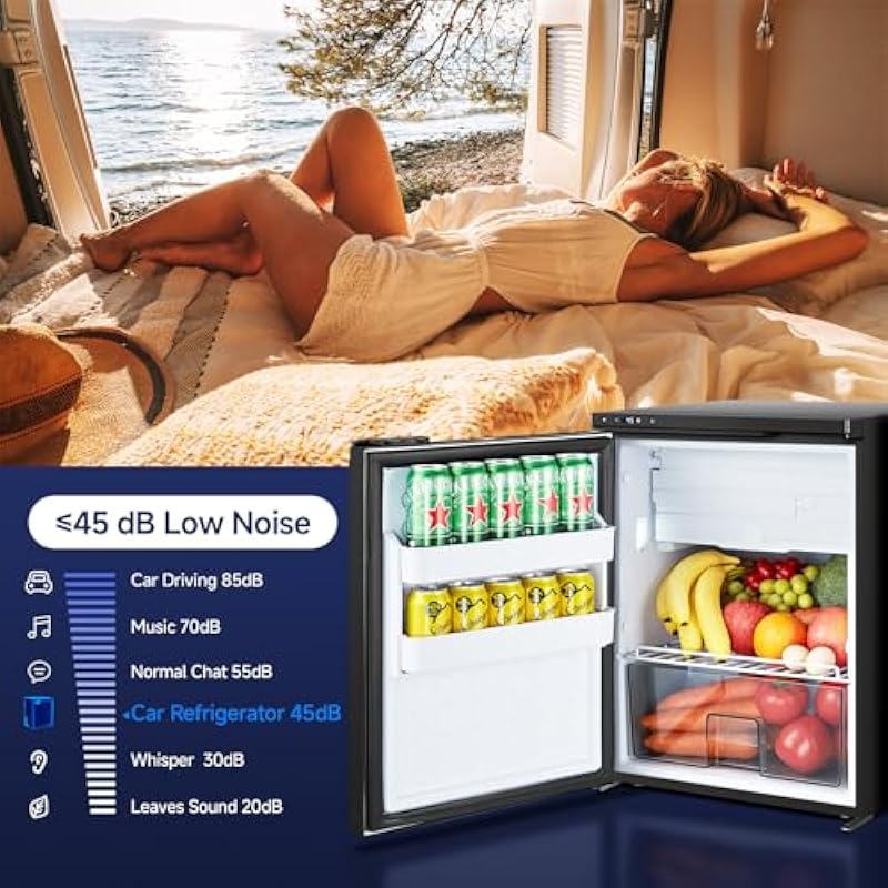 - Energy Saving & Low Noise: BODEGACOOLER RV car refrigerator is energy-efficient and highly efficient. ECO mode further reduces energy consumption, offering an environmentally friendly cooling solution. Its low-noise design (<45 dB) ensures a silent and comfortable environment. Equipped with anti-slip technology, the unit maintains stable performance even on bumpy roads.