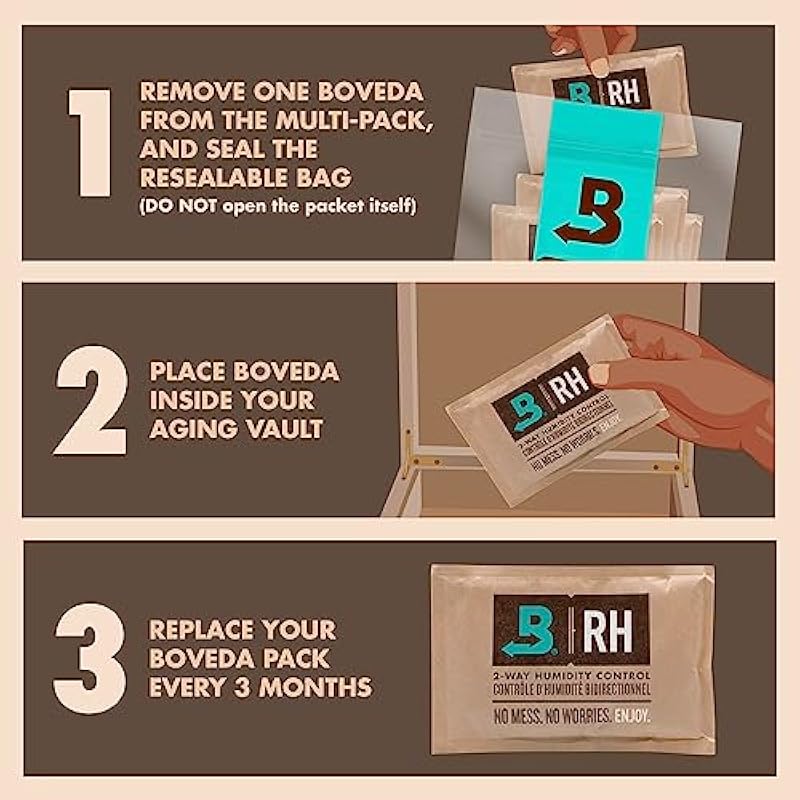 - HOW TO USE: NO MORE REWETTING SPONGES, REFILLING BEADS, OR ADDING MORE GEL! Remove a moisture pack from the resealable bag, slip the Boveda 75 humidity pack into any NON-PLASTIC humidifier box, add premiums, & close the lid. BOVEDA DOES THE REST. DO NOT cut or open the brown humidity packet. Replace every 3 months. You’ll know it’s time to swap out Boveda when it becomes hard and crunchy. NEVER MIX the 75% with any other %RH.