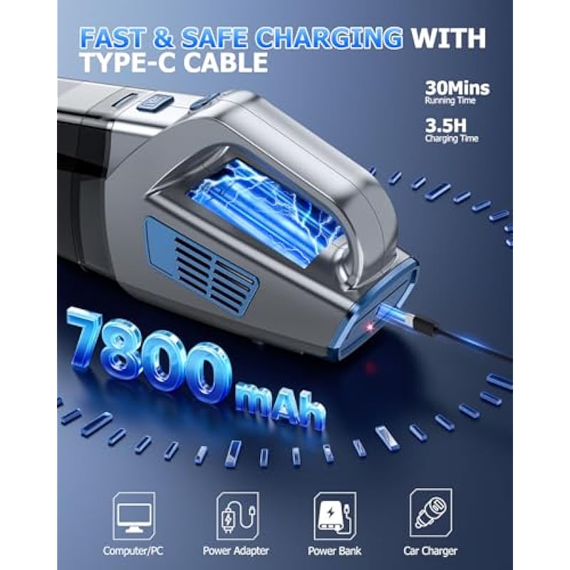 - 🔋【Fast & Safe Charging】This car vacuum portable cordless has a built-in 7800mAh battery. It takes only 3.5 hours to charge and can run continuously for 30 minutes, giving you plenty of time to finish cleaning. What’s more convenient is that it comes with a Type-C charging cable, making charging a breeze—whether it’s a standard household power outlet or a car charger, it works perfectly, so you can recharge it anytime, anywhere