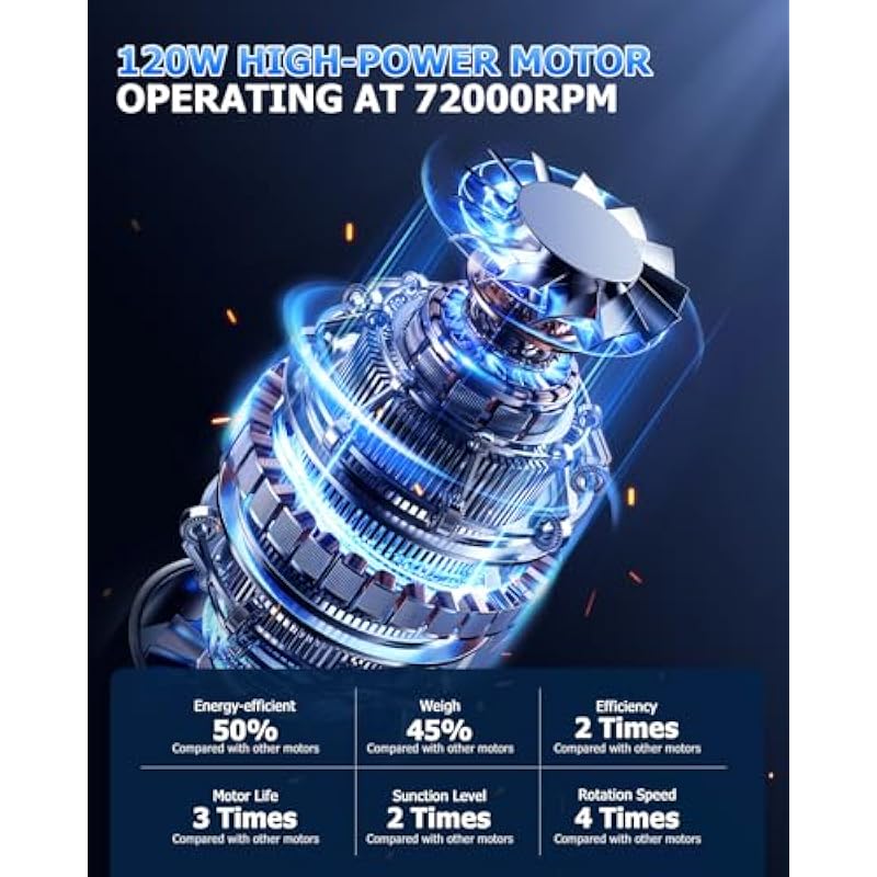 - 🌪️【16000PA Strong Suction】This handheld vacuum cordless is equipped with a high-powered motor that operates at 72,000 RPM, generating a strong suction power of up to 16,000 PA. With such suction, it easily cleans up scattered dust and debris on the floor, tangled pet hair in carpets, and stubborn dirt deep in hard-to-reach corners. Its efficient cleaning capability allows you to quickly restore a clean environment without much effort, bringing you a more comfortable living experience