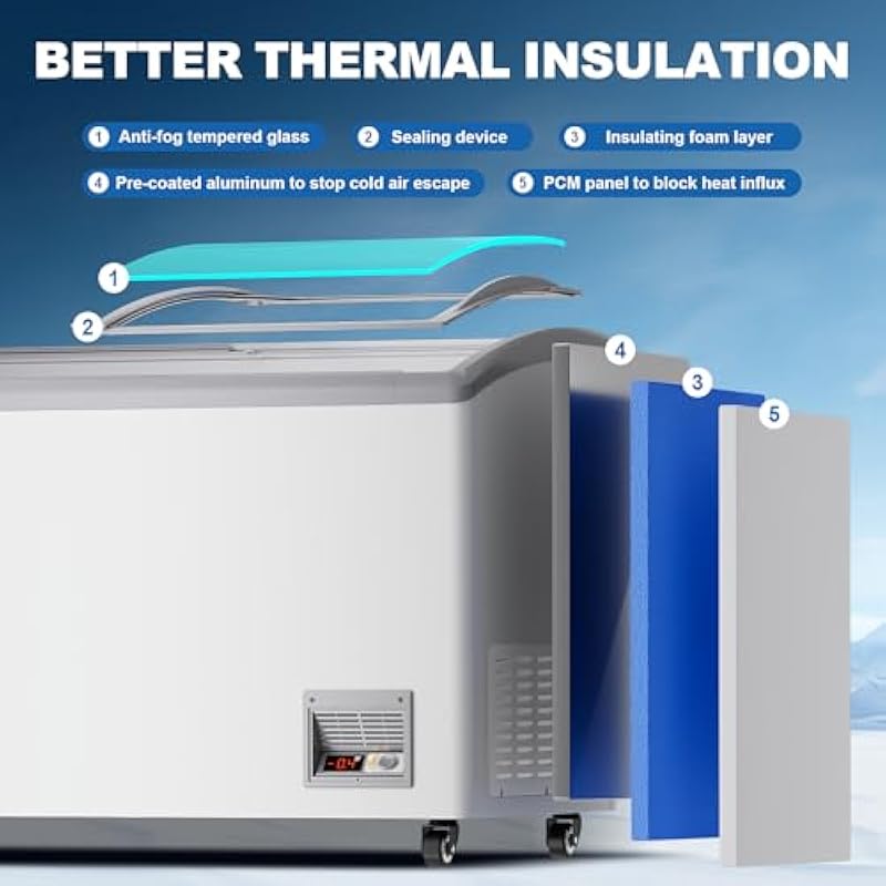 Ice Cream Freezer 13 Cu.Ft Display Case Commercial, Glass Top Chest Freezer with 8 * 3 Gallon Tubs, 2 Sliding Glass Doors, Rolling Wheels and Lockable Breaks