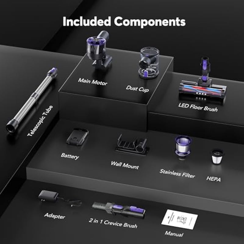 | Included Components | Cordless Vacuum Cleaner Main Unit with 500 ML Dust Cup Ć 1; Battery Ć 1; Telescopic Vacuum Tube Ć 1; Motorized Floor Brush Ć 1; 2-in-1 CreviceBrush Ć 1; Mini Cleaning Brush Ć 1; Charger Ć 1; HEPA Filter Ć 1; Stainless FilterĆ 1; Vacuum Cleaner Wall Mount Ć 1; User Manual Ć1 |