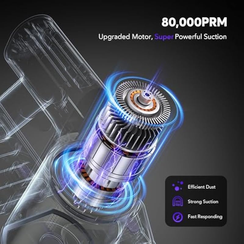 | Special Feature | 40 minutes of battery time; 80,000PRM upgraded motor; Upgraded anti-tangling brush; 0.5L large dust cup, a key to empty; 5 layers of precision filtration system; 12000Pa suction; A variety of accessories for a variety of use of scenes; 2600mAh removable battery, 3 charging ways |