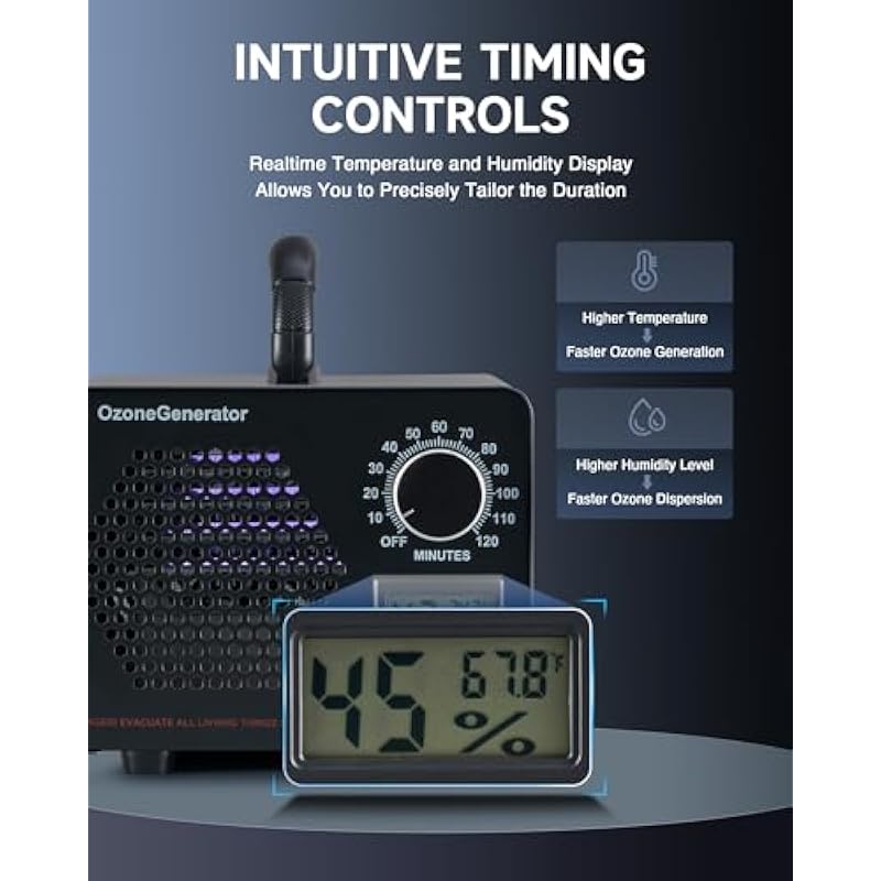 - Intuitive Operation: With the handy timer knob, you can easily set the duration for optimal purification. The temperature and humidity display provides realtime feedback, letting you monitor and adjust settings with ease