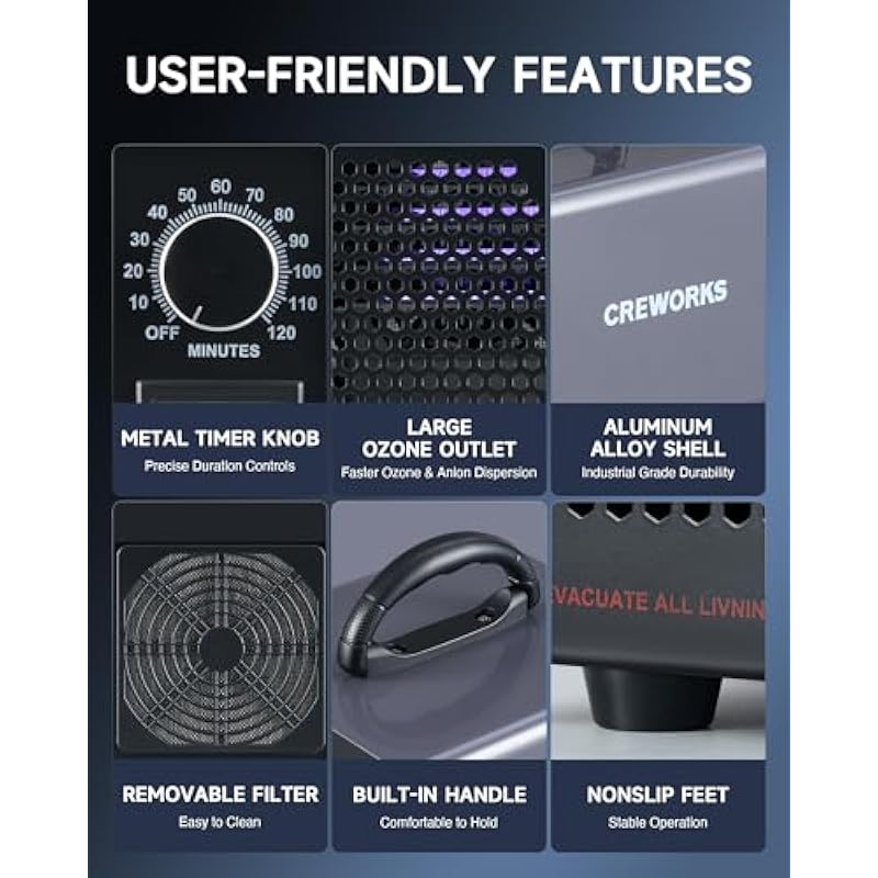 - Comprehensive Air Purification: This Creworks ozone generator quickly produces a sufficient amount of O3 molecules to let them interact with various pollutants and airborne contaminants, eliminating tough odors at the source instead of masking them