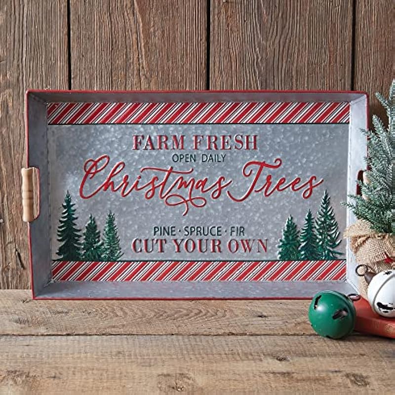 - Display your wrapped holiday treats and trinkets on this Farm Fresh Christmas Trees Tray.