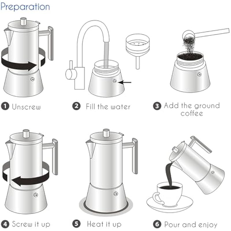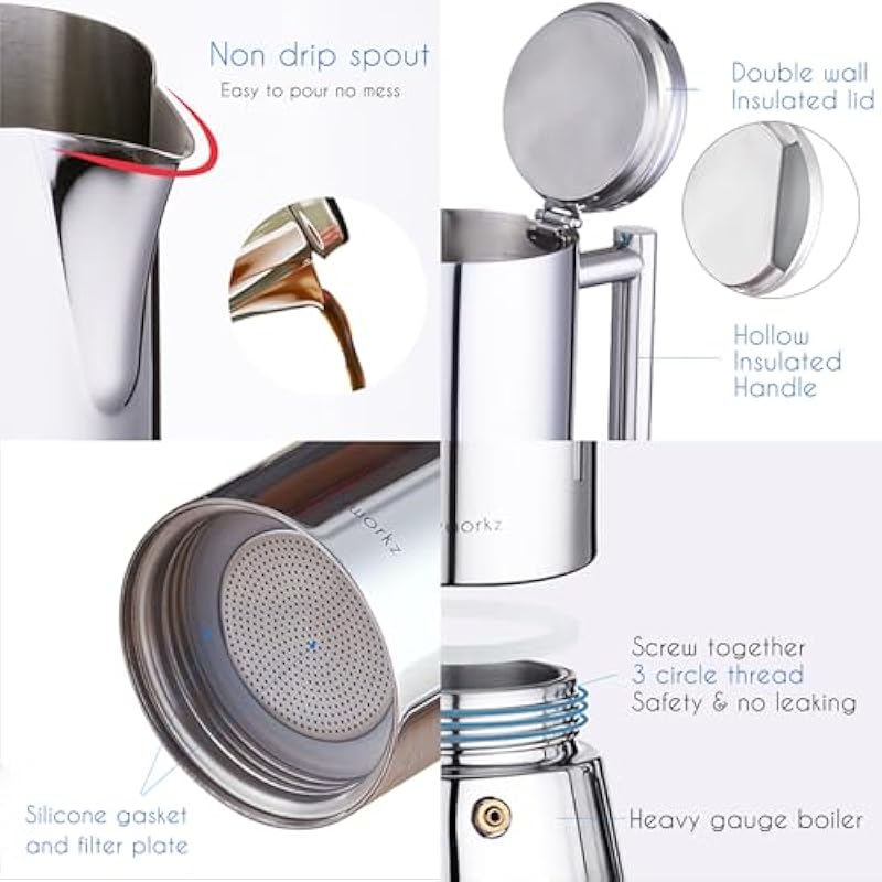 - [Premium Quality 18/8 Stainless Steel Moka Coffee Pot] Made of 18/8 Stainless Steel with high mirror polishing processed. The ability of anti-rust and corrosion is also the best. Can be used for all kinds of heat resource, such as gas stove , induction burner , electric cooktop.Easy to clean and disassemble. Dishwasher safe.