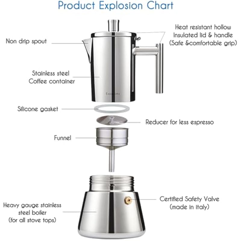 - [Elegant and Heat Resistant Design] Used the latest manufacturing technology and combined aesthetics to design this elegant espresso coffee pot. The heat resistant hollow insulated lid and handle grip make it convenient to use. Base is heavy gauge Magnetic stainless steel,ensuring its long life time at high temperatured heat resource.