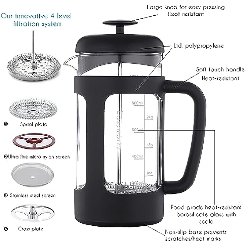 - Used the latest manufacturing technology and combined aesthetics to design this elegant french coffee pot, tea pot .With the 4 levels extra fine micro stainless steel mesh filter, you could brew your coffee or tea with the filter, to get a better taste without the coffee grounds mixing in your coffee.