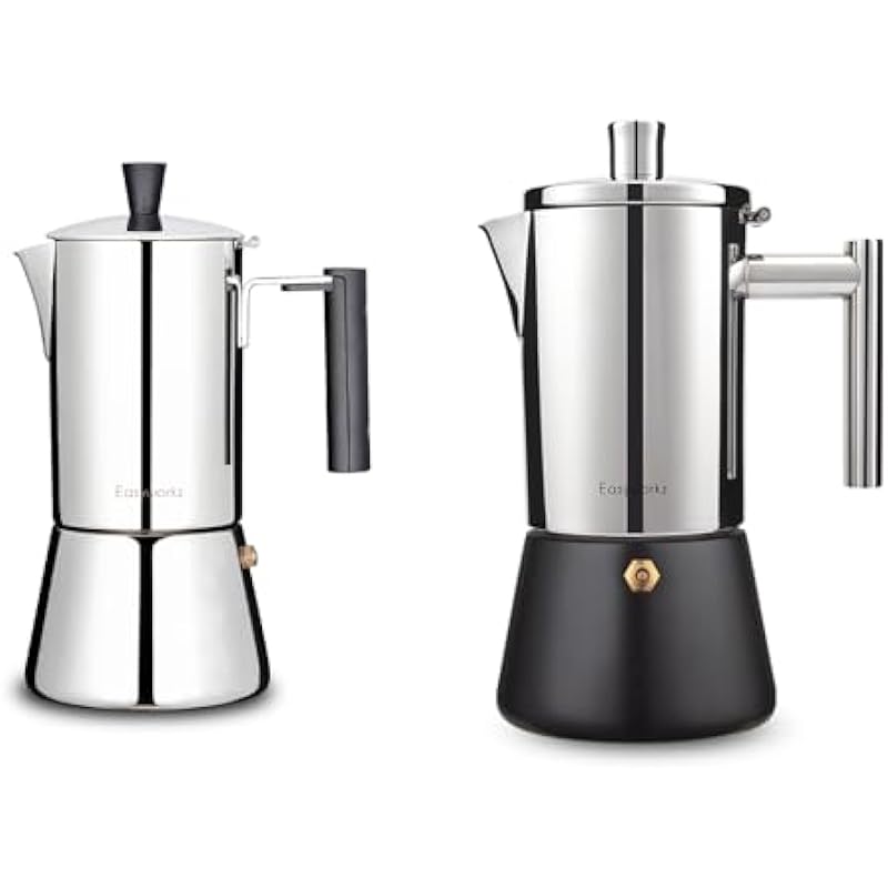 - [Elegant and Heat Resistant Design] Used the latest manufacturing technology and combined aesthetics to design this elegant espresso coffee pot. The heat resistant plastic knob and handle grip make it convenient to use. Base is heavy gauge Magnetic stainless steel,ensuring its long life time at high temperatured heat resource.