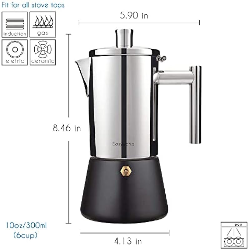 - [Premium Quality 18/8 Stainless Steel Moka Coffee Pot] Made of 18/8 Stainless Steel with high mirror polishing processed. The ability of anti-rust and corrosion is also the best. Can be used for all kinds of heat resource, such as gas stove , induction burner , electric cooktop.Easy to clean and disassemble. Dishwasher safe.