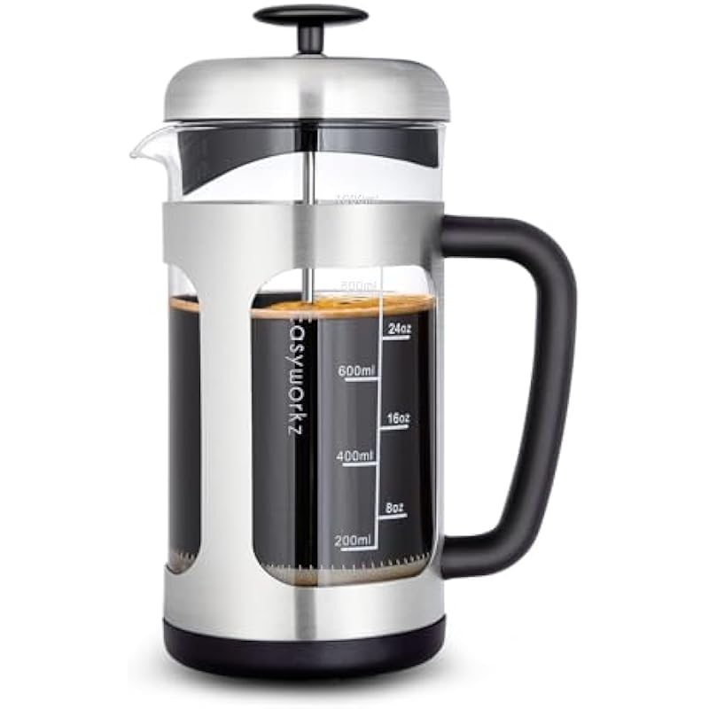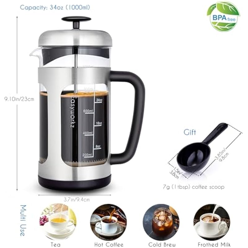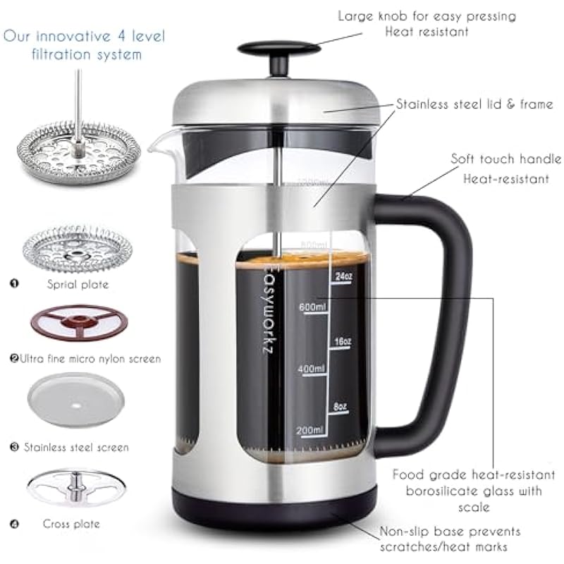 - [French Coffee Pot with Innovative 4 Level Filtration System] Used the latest manufacturing technology and combined aesthetics to design this elegant french coffee pot, tea pot .With the 4 levels extra fine micro stainless steel mesh filter, you could brew your coffee or tea with the filter, to get a better taste without the coffee grounds mixing in your coffee.