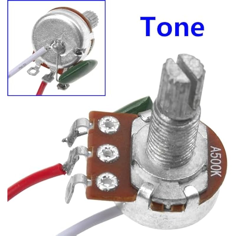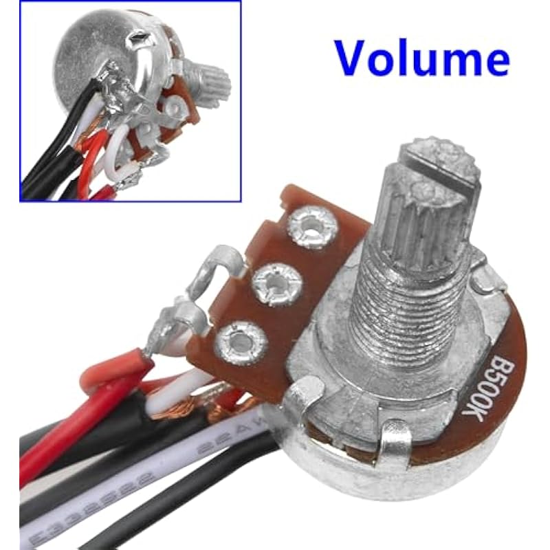 - The guitar wiring harness 2 volume 1 tone 3 way switch comes with 500K full size potentiometers (1 *A500k on Tone positions with green capacitors and 1*B500k on Volume positions) 1/4″ Output Jack
