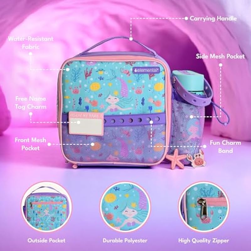 - 𝗦𝗽𝗮𝗰𝗶𝗼𝘂𝘀 & 𝗦𝗺𝗮𝗿𝘁 𝗦𝘁𝗼𝗿𝗮𝗴𝗲 𝗟𝗮𝘆𝗼𝘂𝘁: Elemental kids’ lunch bag features a spacious main compartment and an outer mesh pocket with a charm band perfect for keeping snacks, meals, and small essentials organized.