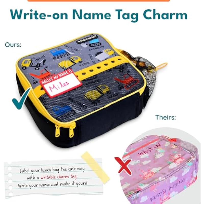 - 𝗪𝗿𝗶𝘁𝗮𝗯𝗹𝗲 𝗡𝗮𝗺𝗲 𝗧𝗮𝗴 & 𝗖𝗵𝗮𝗿𝗺 𝗕𝗮𝗻𝗱: Label your lunch bag the cute way with a writable name tag charm just write your name and make it yours! The built-in charm band also fits most standard charms, so kids can personalize their lunch bag and show off their style at school.