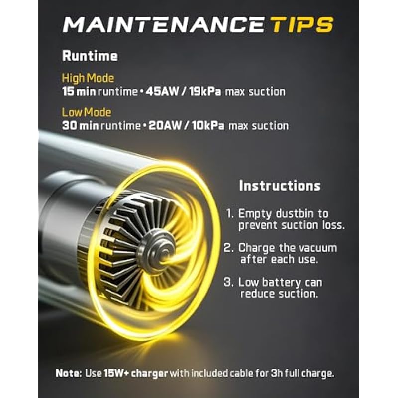 - Note: This car vacuum provides 15 Minutes of runtime in high speed mode. It is Only suitable for Small Jobs such as car interior detailing, office desks, and computer keyboard dust