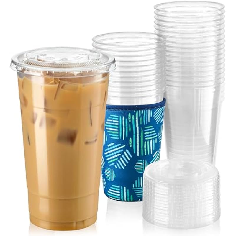 - Durable and Lightweight PET Cups: Made from high-quality, 100% BPA- and PFAS-free plastic, ensuring both durability and reliability. These plastic cups with lids and sleeves are 100% food-safe and freezer-safe, designed to handle everyday use while being lightweight enough to carry anywhere. These cups are perfect for any cold drink, smoothies, fresh juices, sodas and iced coffee.