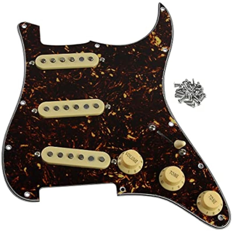 - Pickguard: Made of 1 ply celluloid and 3 ply PVC material(brown tortoise shell),11 screw hole in the side of pickguard, 3 single coil pickup holes.