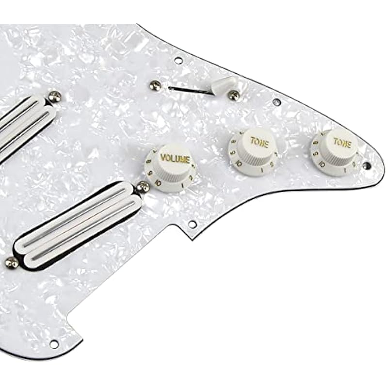 - Pickguard: Made of 1 ply celluloid and 3 ply PVC material(white pearl),11 screw hole in the side of pickguard, 3 single coil pickup holes.