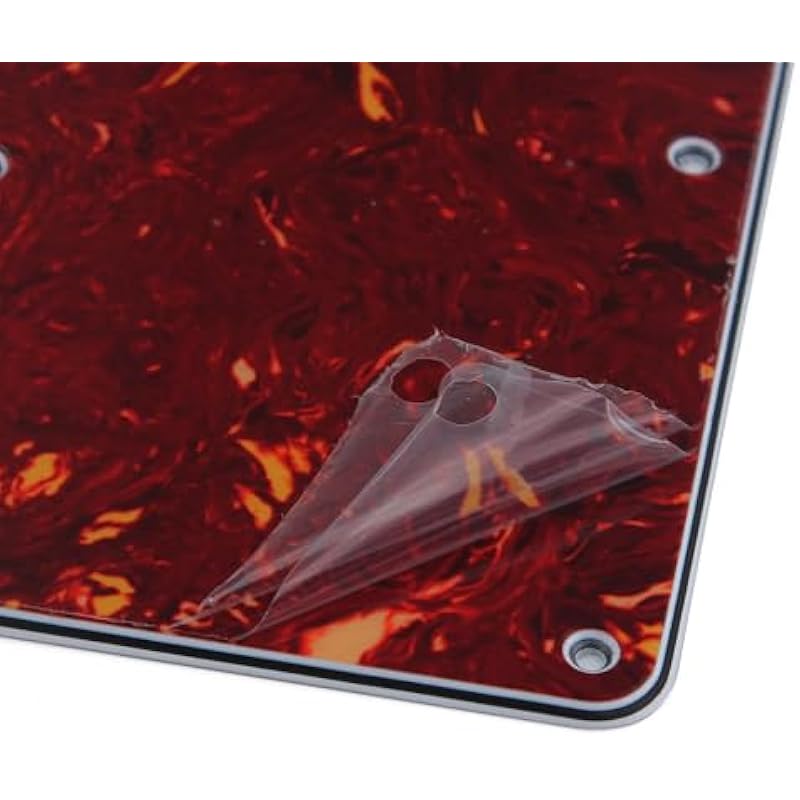 - Material: 4Ply red tortoise shell/white/black/white, made of quality celluloid and PVC plastic material. There are 2 layers thin protective film on the front surface of the pickguard, peel off after installation