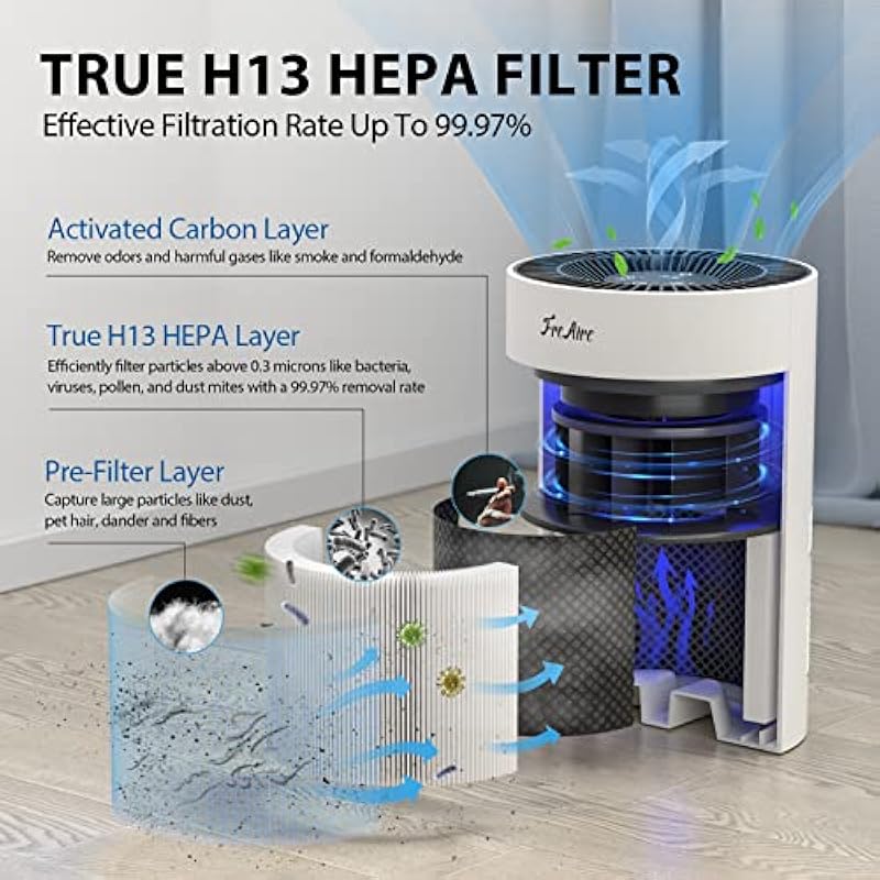 - 【HEPA Air Purifier】 FreAire air purifiers adopt a 3-level high-efficiency filtration system that effectively filters smoke, pollen, pet dander, odors, and air particles as small as 0.3 microns.