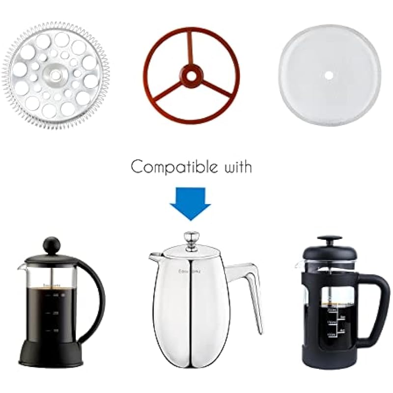 - [Innovative 4 Level Filtration Kit Set] Used the latest manufacturing technology and combined aesthetics to design this replacement kit set for french coffee pot. With the 4 levels extra fine micro stainless steel mesh filter, you could brew your coffee or tea with the filter, to get a better taste without the coffee grounds mixing in your coffee.
