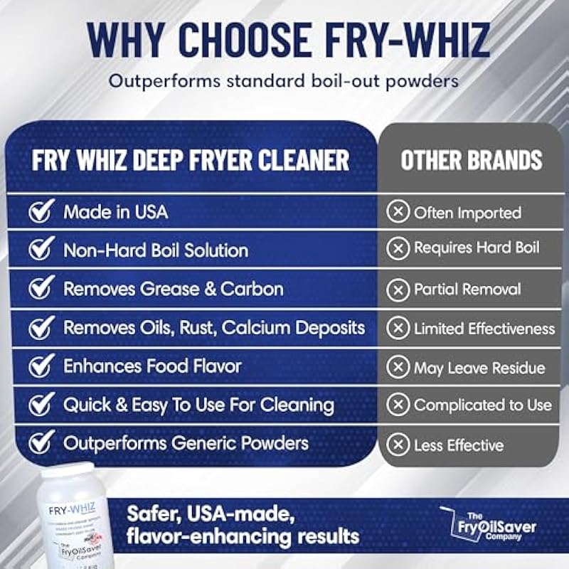 - FRY-WHIZ EASY-TO-USE DEEP FRYER CLEANER – Effortlessly maintain a spotless fryer and improve the flavor of your fried foods with Fry-Whiz Easy-to-Use Deep Fryer Cleaner. Simply drain your fryer, follow the label instructions, and avoid hard boiling for safe and effective cleaning. This powerful formula works quickly to loosen stubborn grease and residues—just scrub away buildup and rinse thoroughly for a cleaner, tastier frying experience. Ideal for busy kitchens, Fry-Whiz makes fryer maintenance simple and hassle-free. DO NOT HARD BOIL for optimal results.