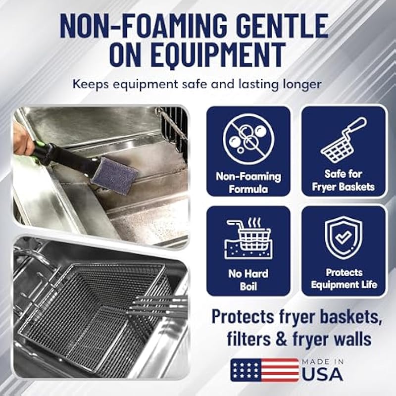 - NON-FOAMING, HIGH-PERFORMANCE COMMERCIAL FRYER CLEANER – Simplify fryer maintenance with Fry-Whiz Commercial Fryer Cleaner, a powerful non-foaming formula designed to restore your fryer to its original brilliance. Effortlessly eliminate grease, carbon buildup, oils, and burned-on residue while enhancing your fryer’s performance and extending its lifespan. Perfect for use in restaurants, food trucks, commercial kitchens, and catering operations, Fry-Whiz ensures your fryer stays sparkling clean and ready for efficient cooking.
