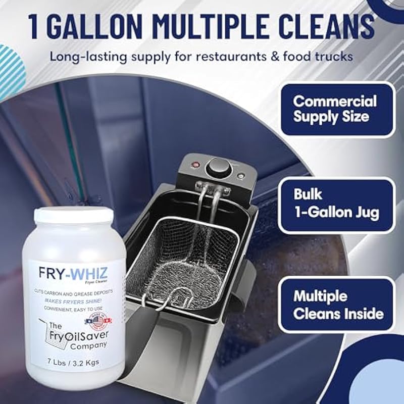- POWERFUL COMMERCIAL-GRADE CLEANING SOLUTION – Keep your fryer performing at its best with Fry-Whiz Deep Fryer Cleaner, the cleaning solution for professional kitchens and home use. Specially formulated to tackle the toughest cleaning challenges, Fry-Whiz effortlessly removes baked-on grease, carbon buildup, rust, calcium deposits, oils, fats, and burned-on residue. Ideal for deep fryers, griddles, ovens, and other commercial kitchen equipment, this powerful cleaner ensures your appliances are spotless, hygienic, and operating efficiently. Whether in a restaurant, food truck, or catering kitchen.