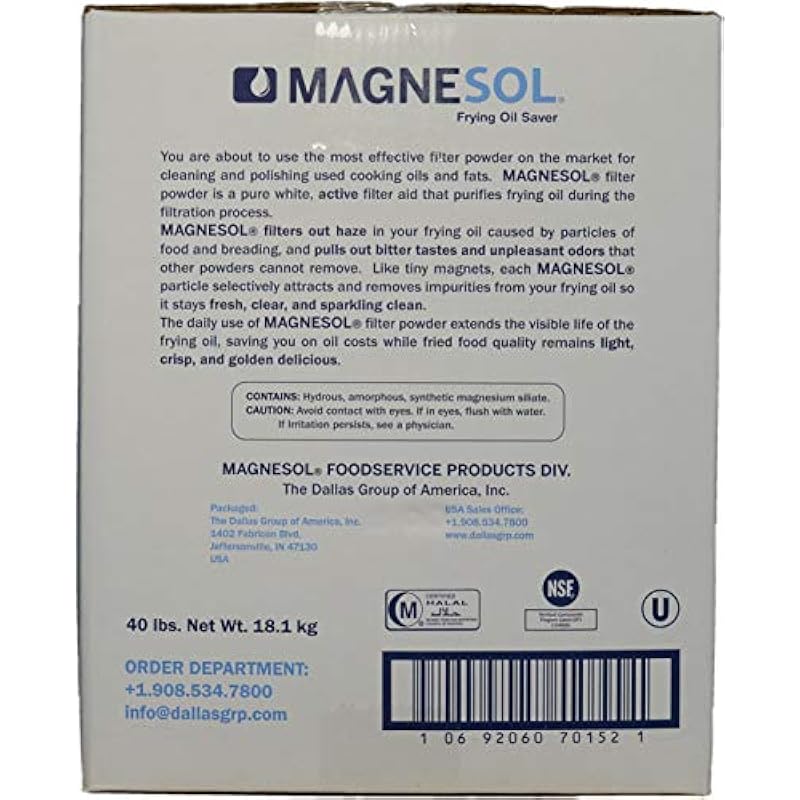 - 5. MAGNESOL XL – Frying Oil Saver – a safe synthetic magnesium silicate -meets the food-grate specifications of the U.S. Food and Drug Administration (FDA), National Sanitation Foundation (NSF) and the Joint Expert Committee on Food Additives of the World Health Organisation. Each Magnesol XL particle acts like a tiny magnet to attract and hold onto polar compounds such as Free Fatty Acids (FFA), Omega Fatty Acids, color, odor and many of the secondary and tertiary by-products of degradation
