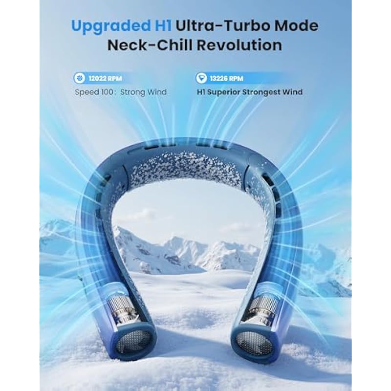 - Next-Gen H1 Turbo Mode & 1-100 Scroll Switch: Our personal neck coolers featuring a dual-function wind adjustment system with independent controls, 6 speeds from soothing-soft airflow (1-5 speeds) to H1 superior strong wind (double press to H1 mode at any speed, to activate high-speed ultimate strongest wind); Customized wind by scroll switch from 1 to 100 adjusted, delivering personalized comfort with efficient cooling while working, traveling, camping, at school, gym, or in the office