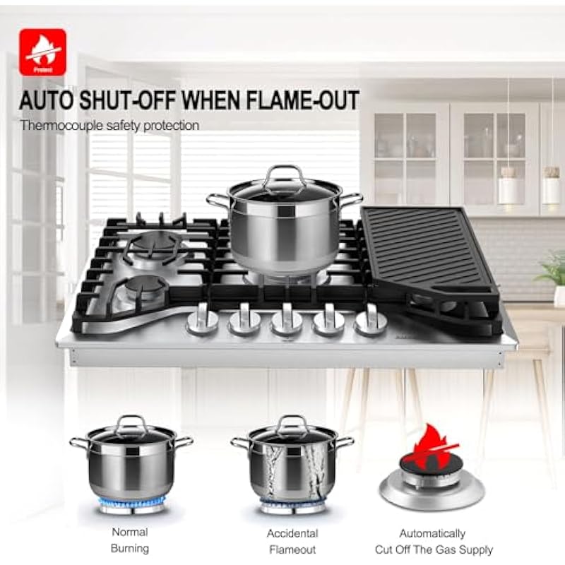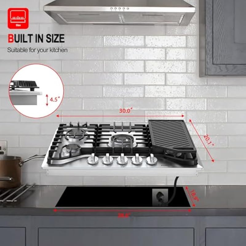 - 【Easy Maintenance】Built with 304 stainless steel surface, resists stain, heat and discoloration. 5 sealed burners prevent food from falling into them. You can simply remove the grates and wipe clean. The automatic electric pulse ignition uses a 120V AC power(Come with 4FT cord plug), which will be more convenience to your life. The built-in size is 28.6″ x 18.9″ while the whole product size is 30.0″ x 20.0″ x 3.9″ for this built in gas cooktop.