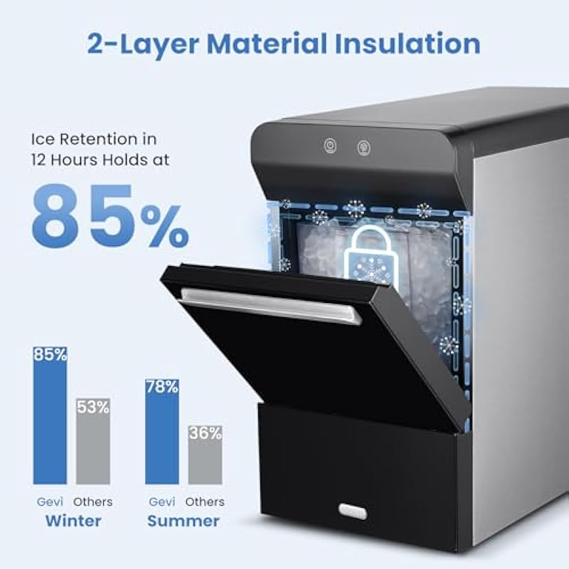 - 𝐃𝐨𝐮𝐛𝐥𝐞 𝐋𝐚𝐲𝐞𝐫 𝐌𝐚𝐭𝐞𝐫𝐢𝐚𝐥 𝐈𝐧𝐬𝐮𝐥𝐚𝐭𝐢𝐨𝐧-Gevi ice maker features advanced 2-layer material insulation that effectively retains ice for up to 12 hours, maintaining up to 85% of its original temperature. This superior insulation ensures your ice stays colder, longer, even in warmer environments.