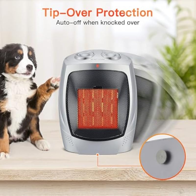 - Overheat protection and tip over protection: Thermostat control of the probable heater for indoor use will turn small space heater off when it reaches a preset temperature and turn the heater back on when the temperature dips below the thermostat setting. The adjustable temperature range is 0℉ to 158℉. The tip over protection system will shut the heater off when the heater was knocked over by accident and it will come back on automatically if it is up righted