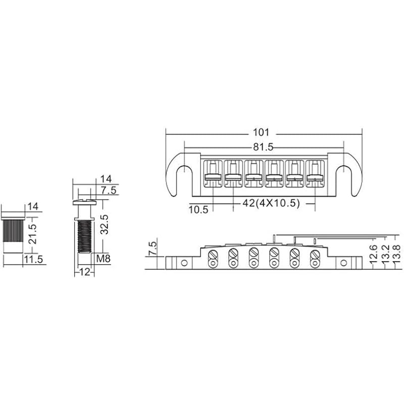 - Bridge Size (L x H): Approx. 101mm x 13.8mm, String Spacing: Approx. 10.5mm(0.41”), Bridge Post distance: Approx. 81.5mm(3.21”).
