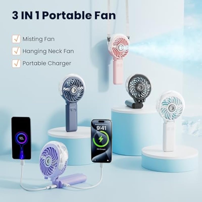 - Package List: Mist fan*1, 50ml Water Bottle*1,USB-C charging cable*1,User Manual*1,Hand Strap*1,Neck Strap*1.