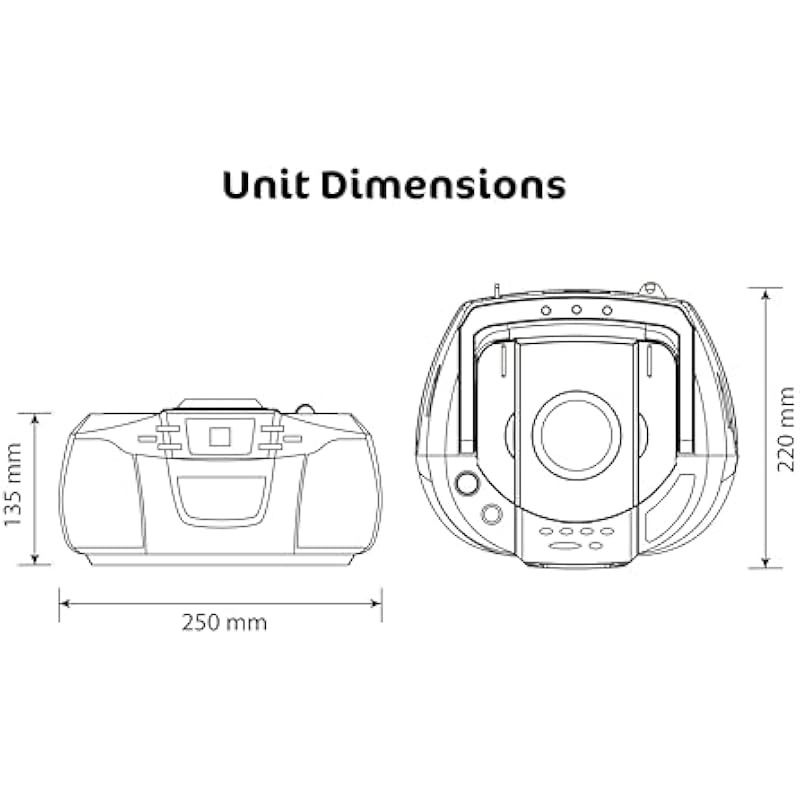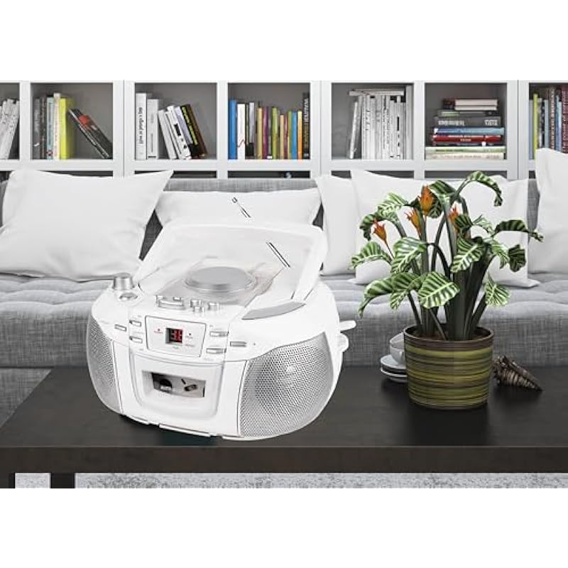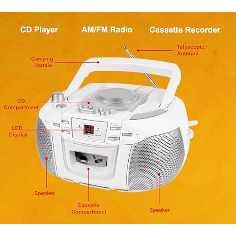 - Portable CD Boombox, AM/FM Radio, Cassette Recorder, Records from CD or Radio, Headphone Jack, LED Display, AC/DC Dual Power Source.