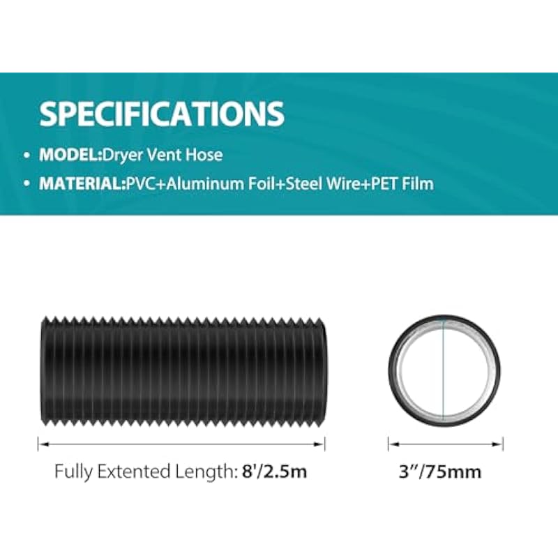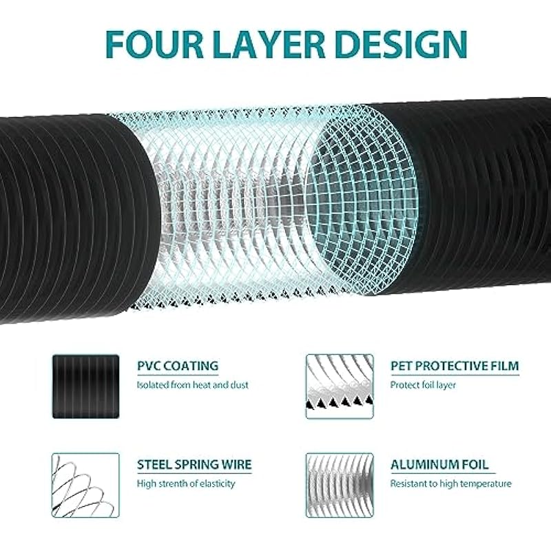 - Heavy Duty Duct Hose: The 3” flexible ducting features 3-layer protection, is made of aluminum foil + PET that protects the ducting from cuts and tears, and the outer layer of black PVC all while resistant to leaks.