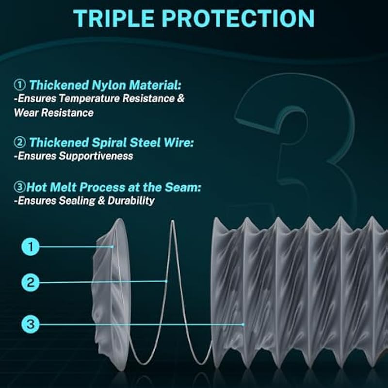 - Heat-Resistant Ducting:The newly upgraded 3-inch flexible duct hose withstands warm air temperatures from 0-100°C. Its nylon construction and heat-sealed joints provide 25% greater heat resistance than older PVC air Ducting.