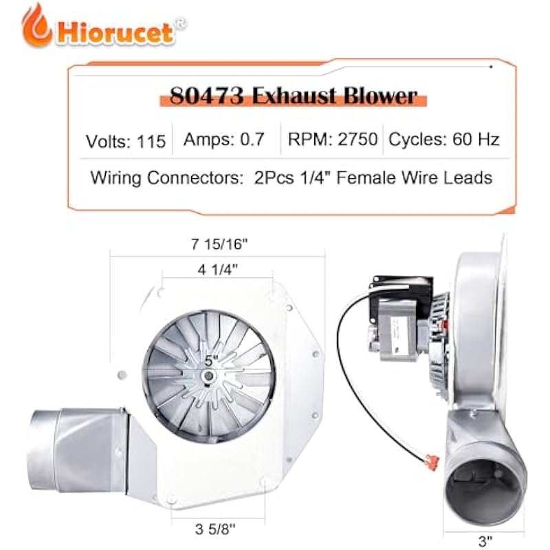 - ► Parameter – The 80473 Exhaust Blower Volts: 115, Amps: 0.7, RPM: 2750, Cycles: 60 Hz, Wiring Connectors: 2Pcs 1/4″ Female Wire Leads, Housing Material: Steel, Includes 500° Gasket – White.
