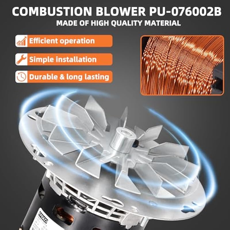 - 【Powerful Functionality】PU-0760028 Combustion Exhaust Blower includes gasket as well as two additional female leads to make installation a breeze, And it provides a steady stream of forced air that keeps the flame burning while allowing you to set the heat range to your desired comfort level