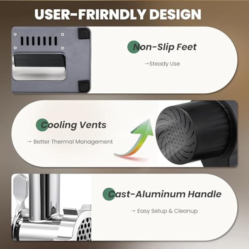 - [Powerful performance] This electric meat grinder features a powerful 1100W motor, capable of grinding up to 3.3 lbs of meat per minute. This heavy-duty grinder is built for efficiency and durability, making it ideal for restaurants, butcher shops, and commercial kitchens