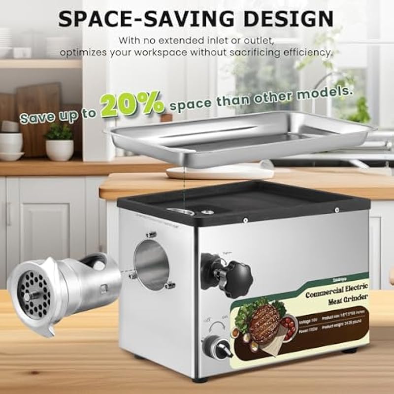 - [Spave saving design] This meat grinder machine with sausage stuffer has a compact design that saves up to 20% more space than traditional models. With no extended inlet or outlet, which maximize your workspace without sacrificing efficiency with this space-saving, high-performance grinder