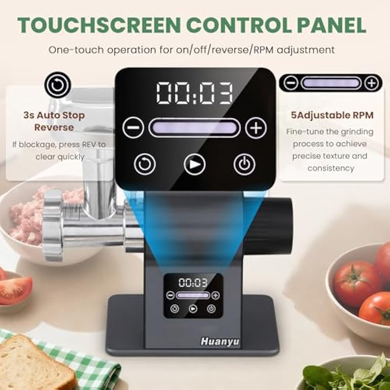 - [Precision touch control with auto-reverse] Operate with ease using the responsive touch panel of Huanyu meat grinder. Select from 5 speed settings for optimal control over texture, from coarse grind for chili to fine emulsification for sausages. The smart reverse function activates for 3 seconds to clear jams and then automatically stops, helping to protect the motor and simplify operation