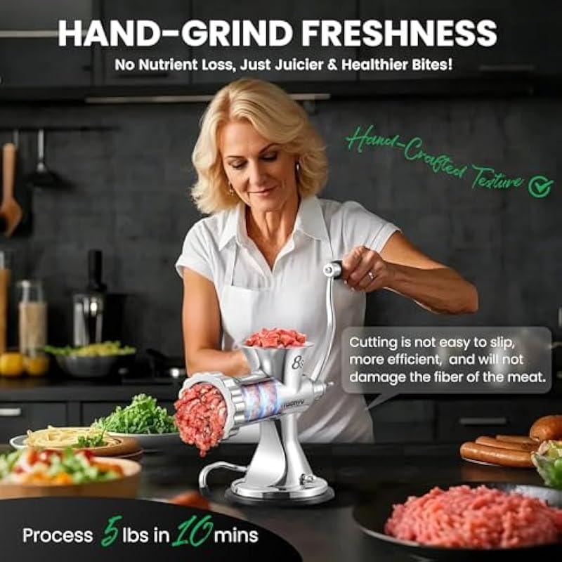 - [Healthier and fresher] This hand crank meat grinder simulates the traditional process of hand-mincing, preserving the natural texture, flavor, and nutrition of your meat. Its sharp, non-slip cutting blade ensures efficient grinding without damaging the meat’s fibers. Enjoy healthier, tastier meals that truly highlight the quality of your ingredients