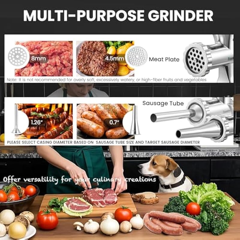 - [Multi-Purpose Grinding & Sausage Making] From beef, pork, and chicken racks to low-moisture vegetables like mushrooms and peppers, this heavy duty meat grinder handles a wide range of ingredients with ease. It also doubles as a sausage maker, offering versatility for your culinary creations. Its quiet operation ensures a smooth and enjoyable cooking experience, without the distraction of loud noise