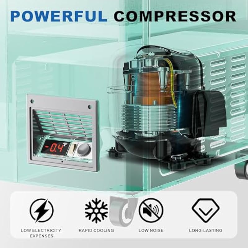 - 【Better Insulation Effect】 To enhance insulation for the ice cream display cabinet, we have incorporated a pre-coated aluminum layer to prevent cold air leakage, an insulating foam layer to retain internal temperature, a rubber sealing device, and curved lockable anti-fog tempered glass to create a sealed environment. The curved anti-fog tempered glass, paired with LED lighting, enhances the visual experience for customers. The PCM shell material is designed for durability and longevity.