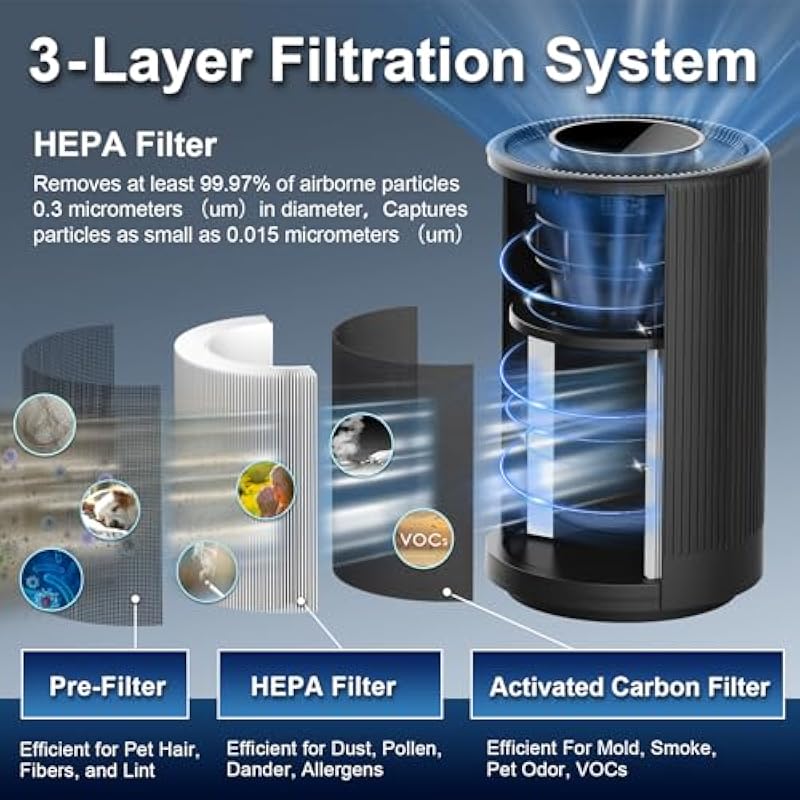 - 3-Level Fan Speeds, 3-Stage Filtration System,Adjust the air purifiers fan speeds for different needs.