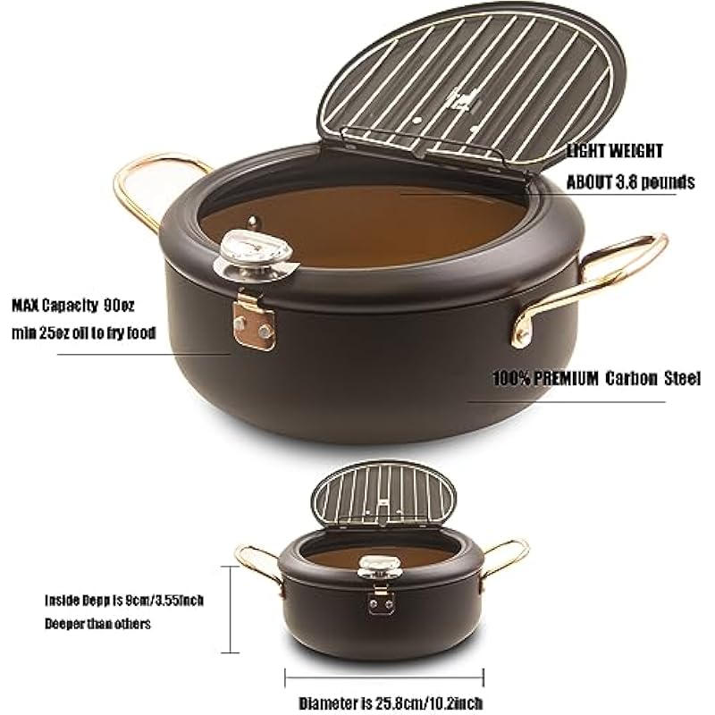 - Health-Conscious Frying with Less Oil & Mess – Enjoy delicious fried favorites like tempura, chicken, and fish with greater control over oil quantity and temperature. The included thermometer helps avoid overheating and overfrying, resulting in lighter, less greasy meals that balance taste and wellness.