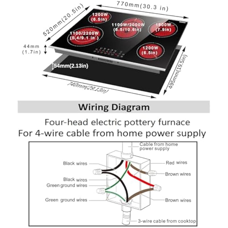 - 【8400W High Power Electric Cooktop】 Karinear 30 inch electric cooktop is equipped with 5 burners, 2 of which have expandable heating elements, convenient for larger cookware. The electric cooktop 5 burners reaches high power output of 8400W: 1200W+1200W +1800W+ 1100W/2000W(Dual) +1200W/2200W(Dual). 8400W High power cooktop heat up more quickly for you. Built-in Ceramic Hob 220-240v hard wired, NO Plug, need a professional electrician for wiring.